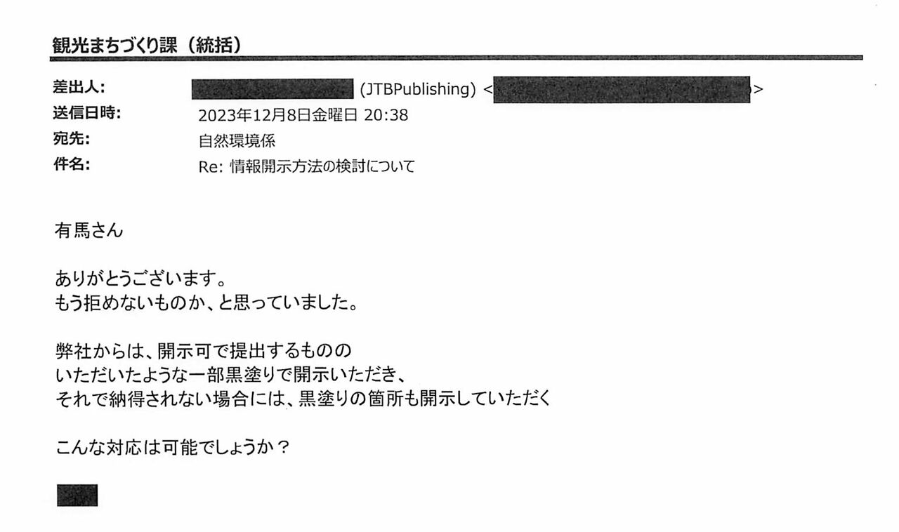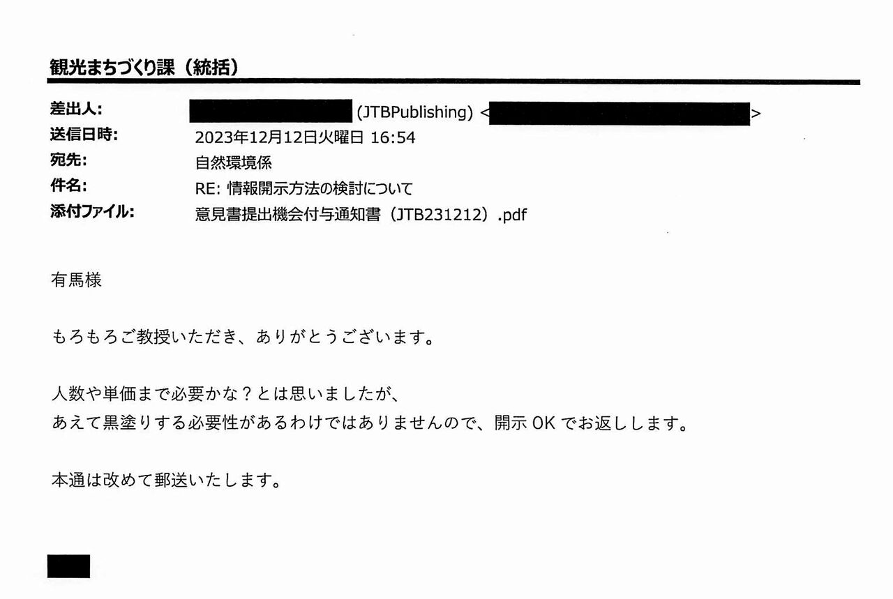 町観光まちづくり課が2023年12月7日にJTBパブリッシングに送信したメール。非公開とする箇所について、業者側の意向を確認する内容だった