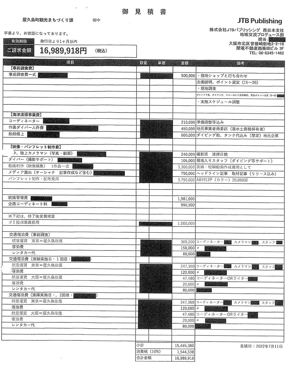 JTBパブリッシングが屋久島町に提出した見積書。再度の情報公開請求を受け、一転して町は全面開示した