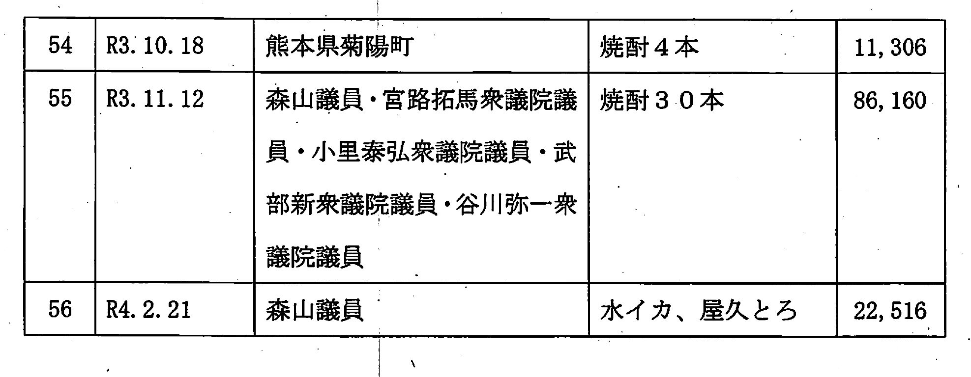 これら森山衆院議員に対する贈答について、その大半は「監査請求期間の徒過」を理由に法的な判断が示されなかった。だが、判決理由のなかでは、2019年5月に焼酎36本を贈って支出した9万2520円や、2021年2~5月に焼酎30本や魚介類などを3件続けて贈って支出した計9万6621円について、「これらの贈答が社会通念上儀礼の範囲内のものであるかについては疑問の余地がある」と指摘された。