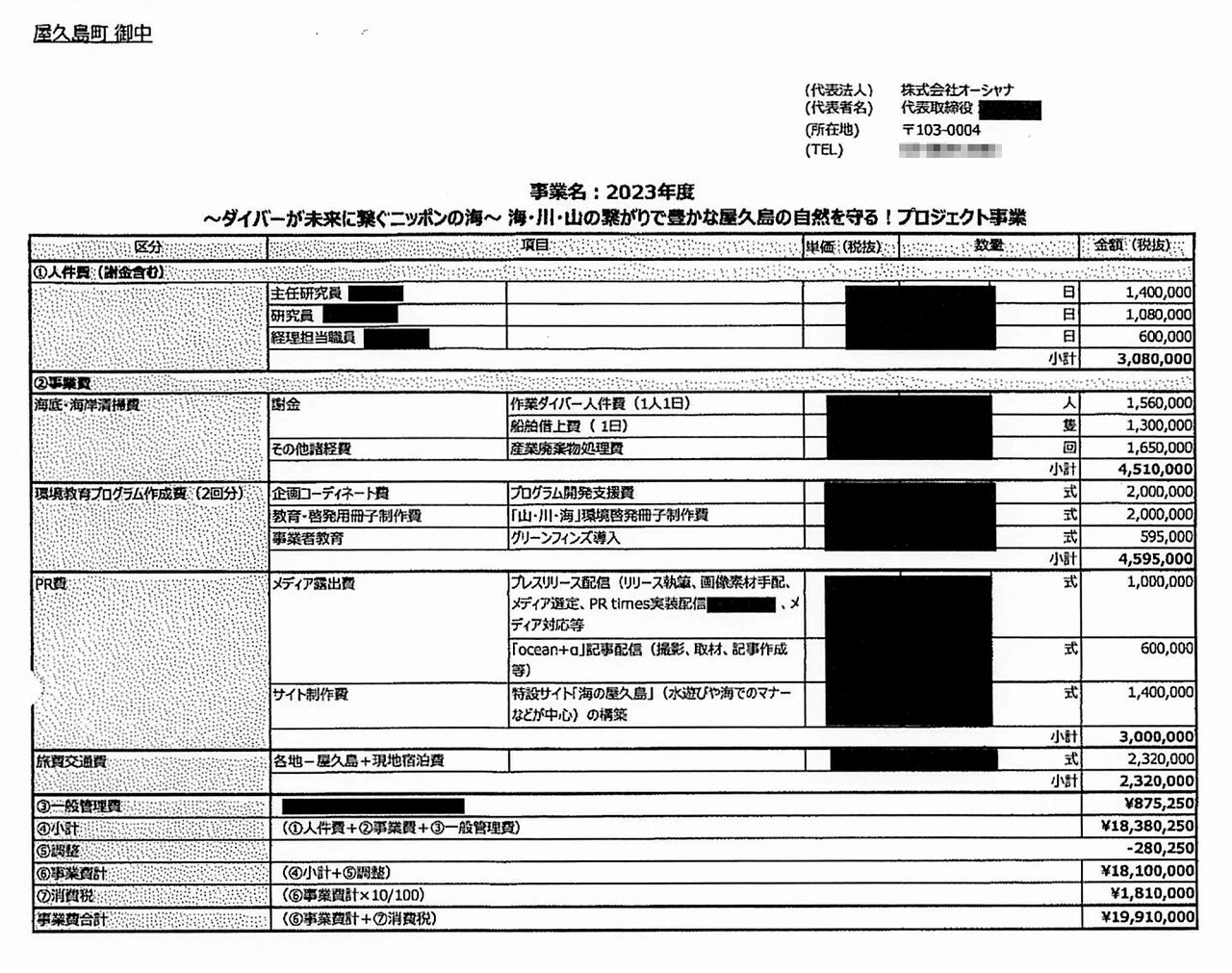 2023年度の海底清掃事業の支出内訳で、屋久島町がオーシャナに提案した単価と数量を黒塗りにして公開する案(モザイクは屋久島ポストが加工)