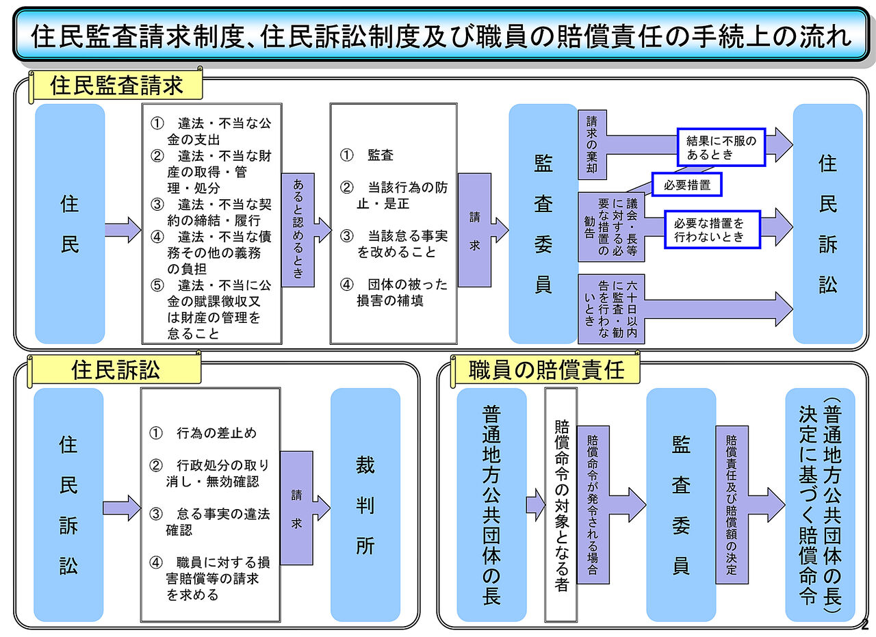 住民監査請求や住民訴訟などの手続き上の流れを示したチャート表(総務省ウェブサイトより)