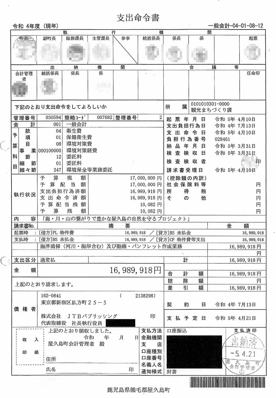 屋久島町が総事業費の約1700万円を業者に支払うために作成した支出命令書。支払日は2023(令和5)年4月21日となっている(モザイクは屋久島ポストが加工)
