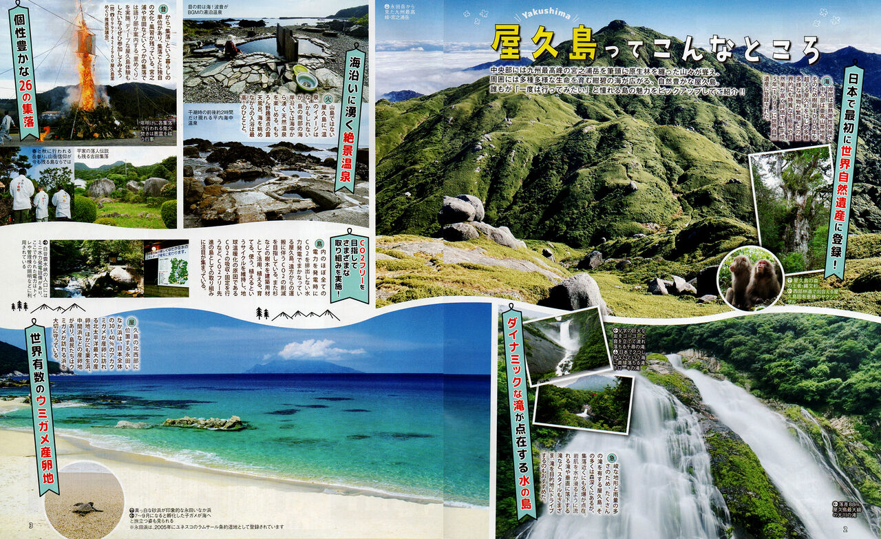 屋久島」。最初の見開きページでは、「屋久島ってこんなところ」と題して、九州最高峰の宮之浦岳(標高1936m)やウミガメの産卵地として知られる永田浜などが紹介されている。