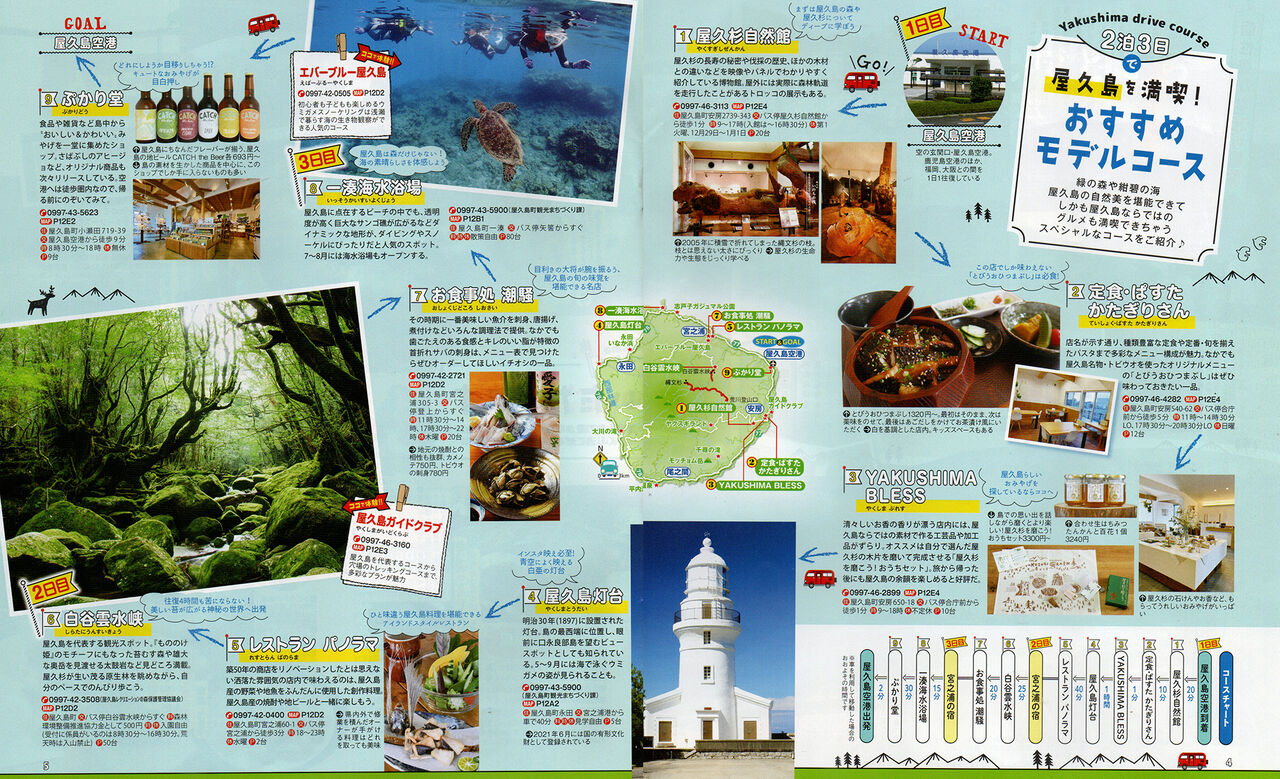 次の見開きページでは、「2泊3日で屋久島を満喫!」の見出しで、おすすめのモデルコースを掲載。屋久島空港から出発して、町立の屋久杉自然館、国の有形文化財に登録された屋久島灯台、太古の原生林が広がる白谷雲水峡などをめぐる行程を紹介している。