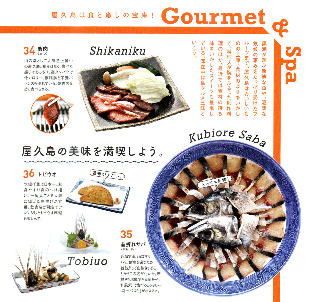 「KADOKAWA」制作の観光ガイド冊子で紹介されている「首折れサバ」や「屋久鹿肉」などの料理。特定の飲食店などの情報は掲載されていない
