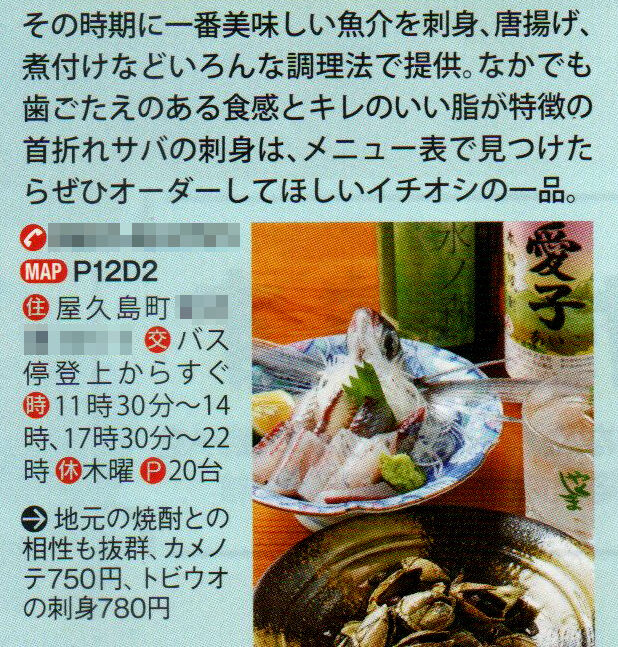 「るるぶ特別編集 屋久島」で紹介された飲食店の記事。店の電話番号や営業時間、メニューの金額などが詳細に掲載されている(モザイクは屋久島ポストが加工)