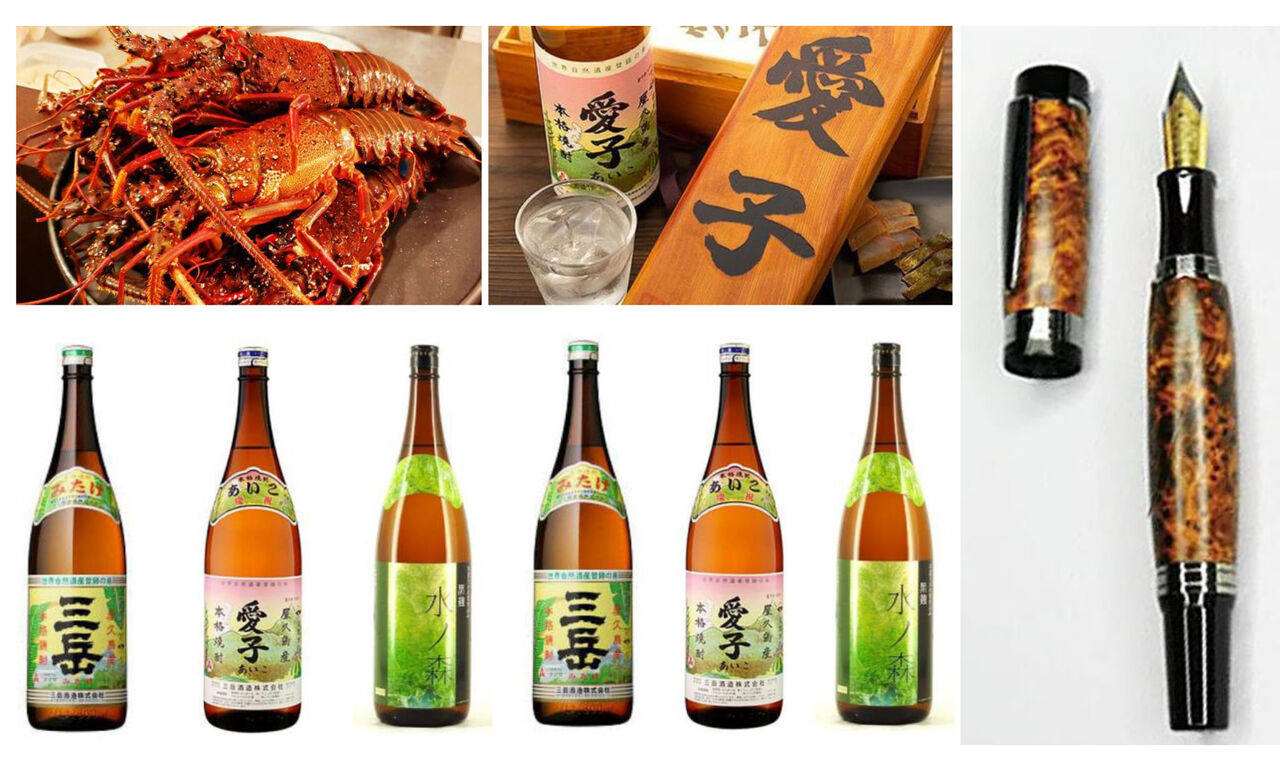 荒木町長が贈答したイセエビ(上左)、屋久杉箱入り焼酎(上中)、屋久島産の焼酎(下)、屋久杉万年筆(右端)
