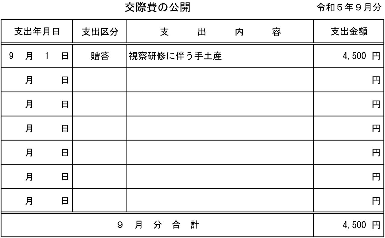 屋久島町のウェブサイトに掲載された2023年9月の町長交際費支出。荒木町長の「視察研修に伴う手土産」として、4500円が支出された
