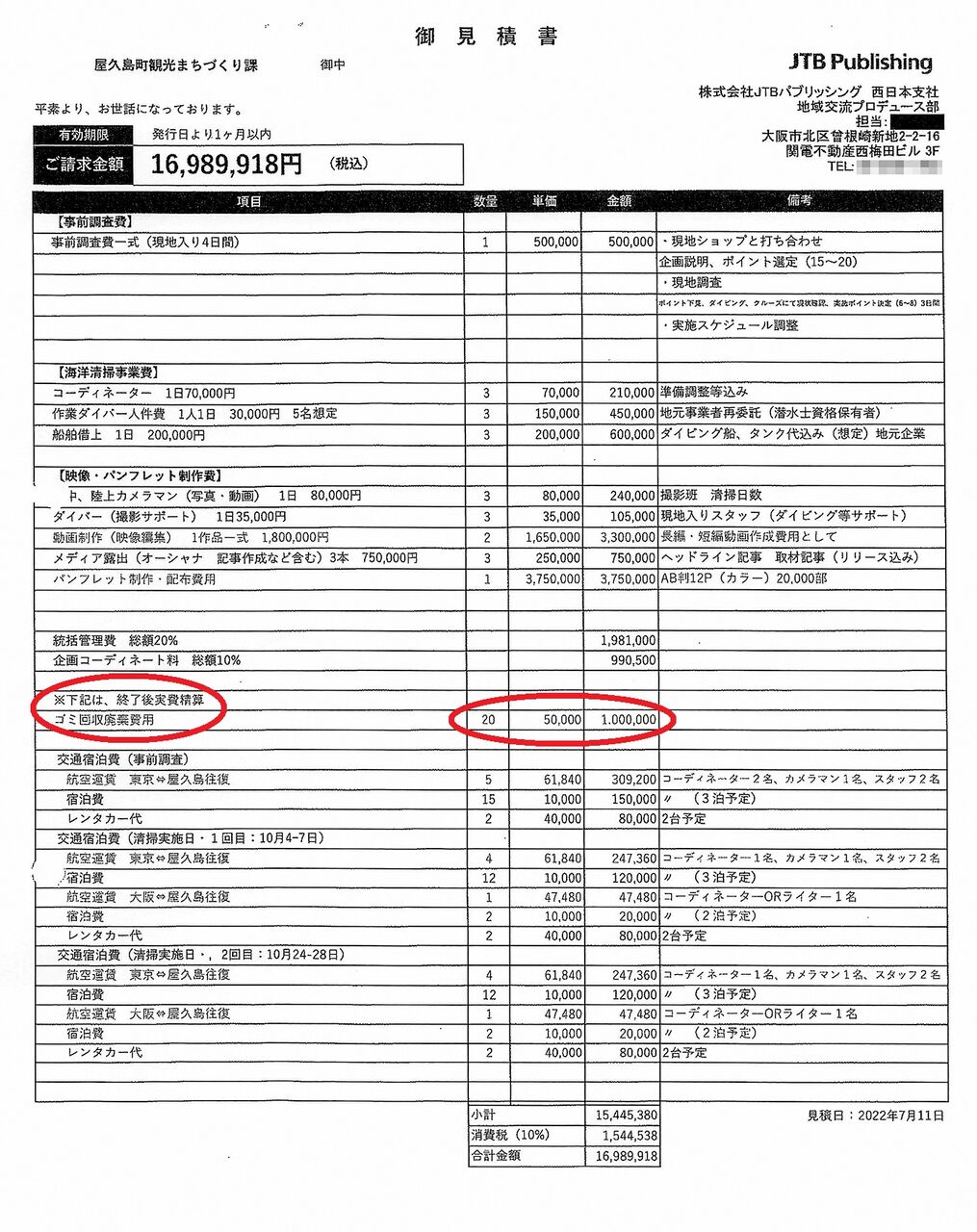 この事業では、旅行大手JTBの出版部門を担う同社が約1700万円の総事業費を提示して、町と特命随意契約を締結した。その際に同社が示した見積書には、「ゴミ回収廃棄費用」を計100万円として、「単価5万円」と「数量20」(1トン袋20個分)と記載。さらに、その上段には「※下記は、終了後実費精算」と書かれ、すべての事業が終わったのちに、実際に回収した海底ごみの量を踏まえて、実費精算することになっていた。