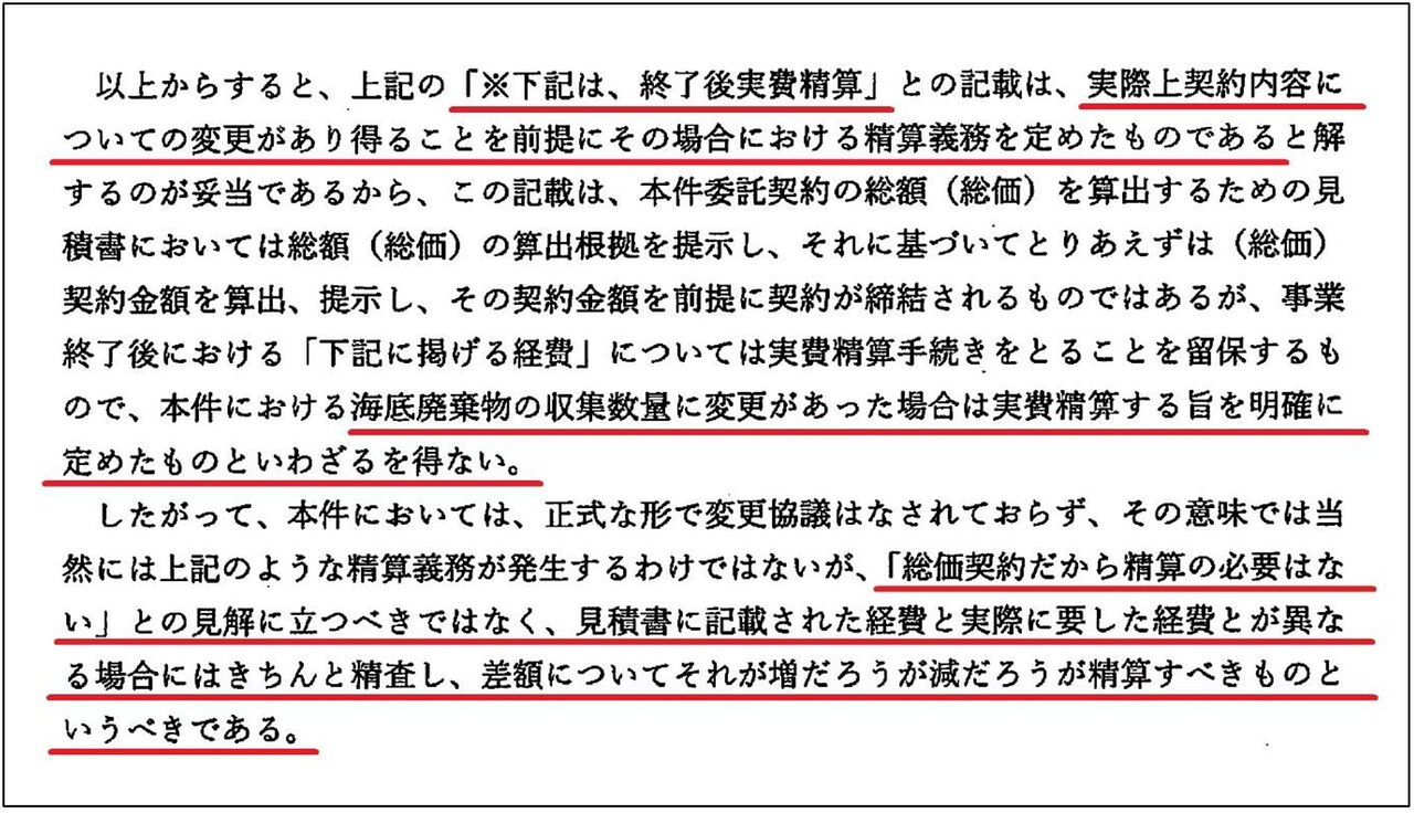 屋久島ポストが町の情報公開制度で入手した行政文書によると、見積書にある「※下記は、終了後実費精算」との記載について、法務事務専門員は町に対し「実際上契約内容についての変更があり得ることを前提にその場合における精算義務を定めたものである」と説明。さらに、実際に回収した海底ごみの量が、見積書にある「数量20」と違う結果になった場合には、この見積書について「実費精算する旨を明確に定めたものといわざるを得ない」と指摘したうえで、「総価契約だから精算の必要はない」との見解に立つべきではないとした。