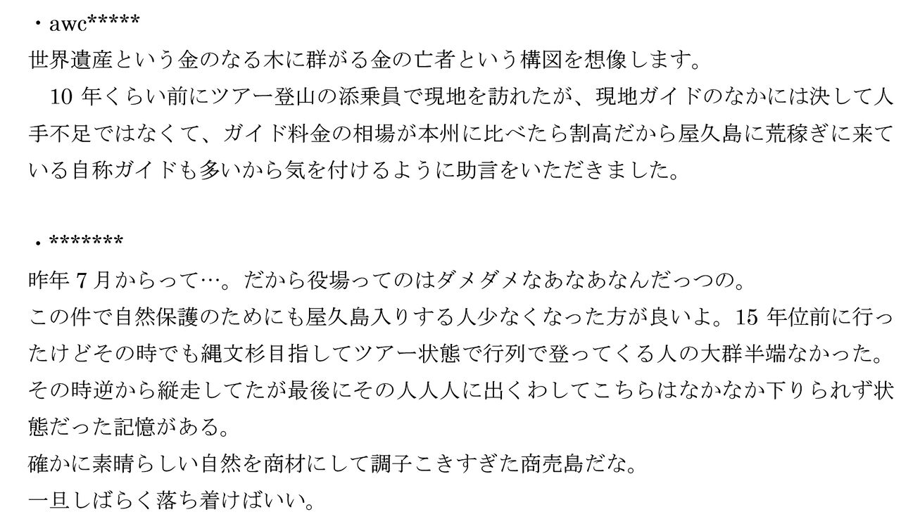 町の条例に従って協力金を集める町、そして町から協力金の収納業務を委託された協議会が、そろって「法的責任はない」と主張する事態を受けて、町内外の批判は高まった。横領事件の記事が公開されたヤフーニュースには、「世界遺産という金のなる木に群がる金の亡者」「自然を商材にした商売島」といったコメントが1000件以上も投稿されるなど、町には厳しい非難の声が寄せられた。
