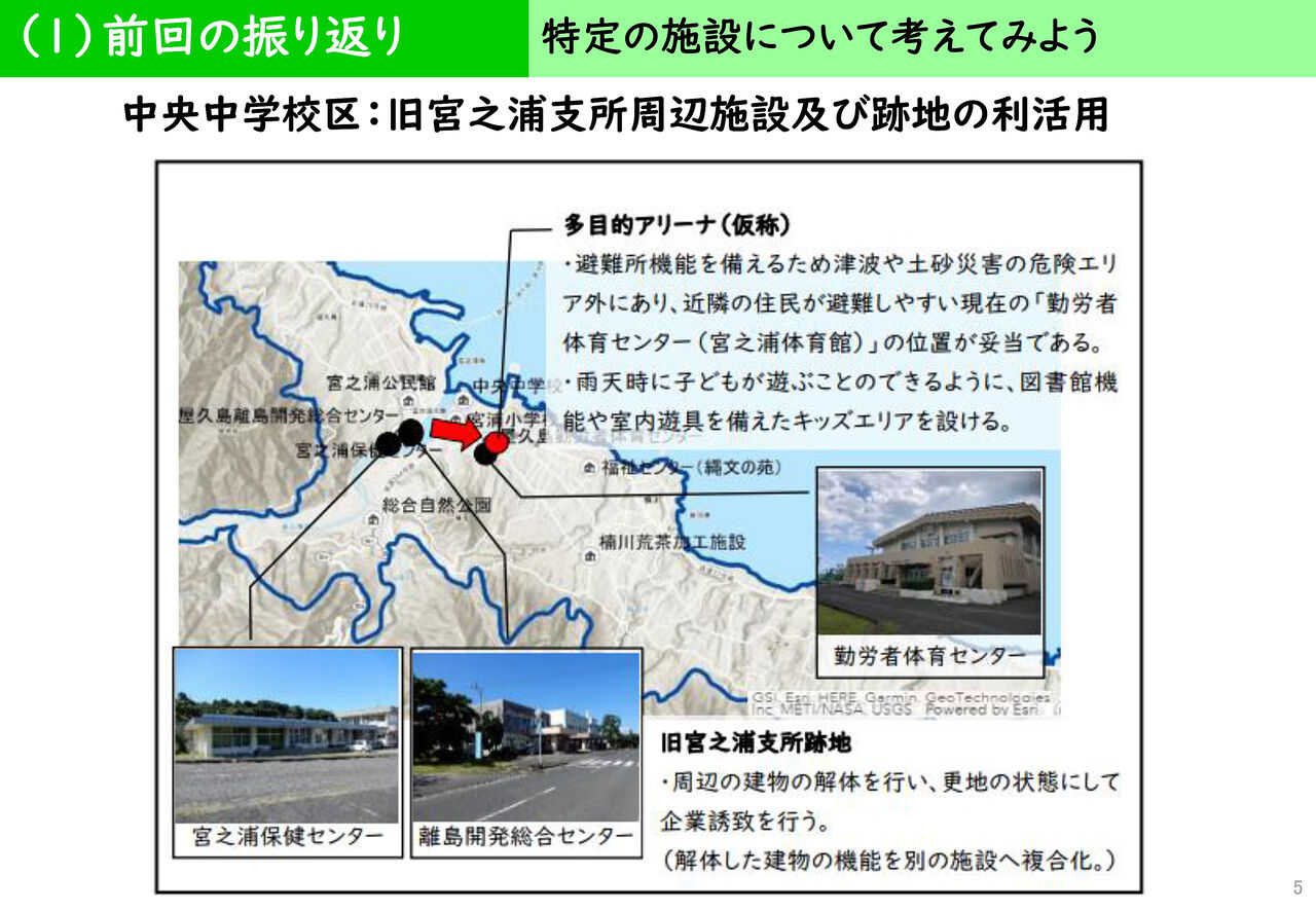 公共施設再配置の住民ワークショップで配布された資料。宮之浦地区における施設についての話し合いでは、文化と体育の施設を統合し、宮之浦に多目的アリーナ(現・多目的交流センター)を建設することを前提に議論が行われた