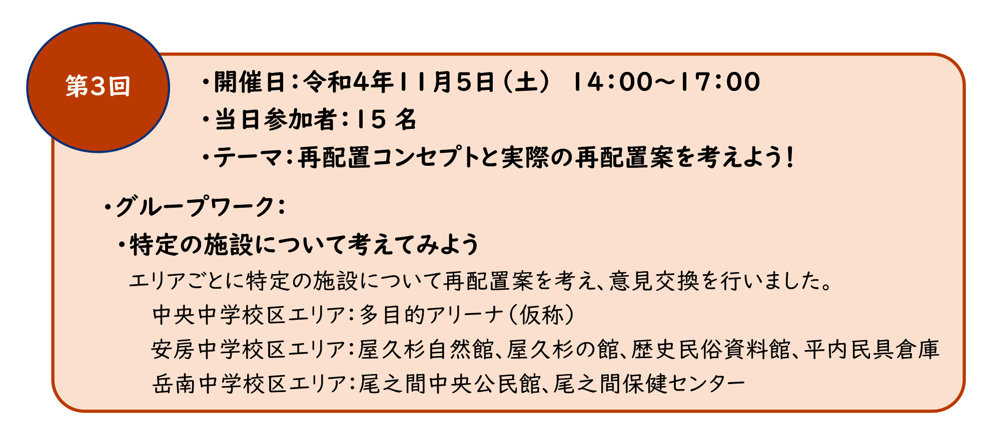 屋久島町公共施設再配置ワークショップ提言書で紹介された第3回WSの内容。安房総合センターは議題にされなかった一方、多目的アリーナ(現・多目的交流センター)は中央中学校区(宮之浦地区)に建設されることが前提となっていた
