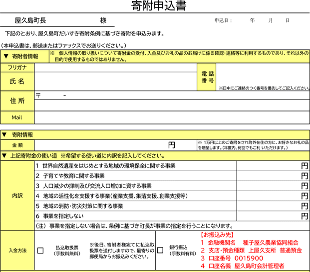 屋久島町がふるさと納税を受け付ける際に提出を求めている申込書の一部。希望する寄付金の使い道を尋ねる欄には、「環境保全事業」や「消防・防災対策」など6件の選択肢が記載されている