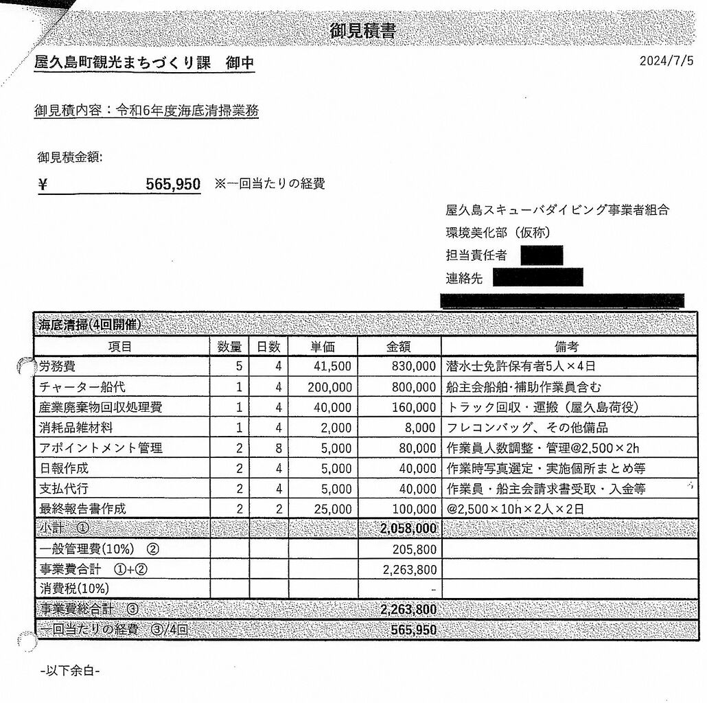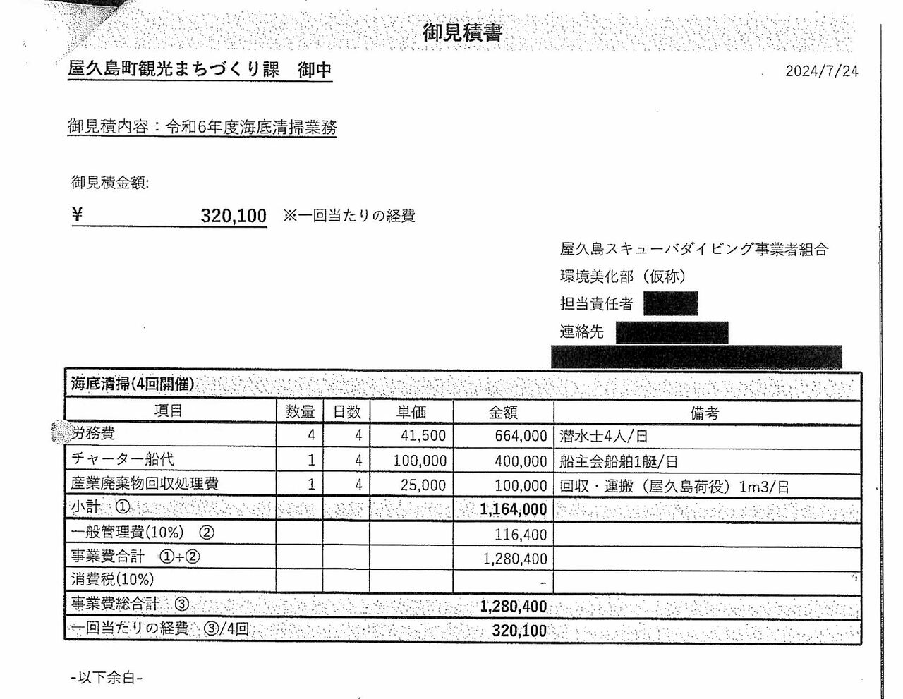 2024年度の海底清掃事業で、屋久島町が屋久島スキューバダイビング事業者組合から取った見積書。見積額が予定価格を超えたため、町は再見積もりを取ることになった