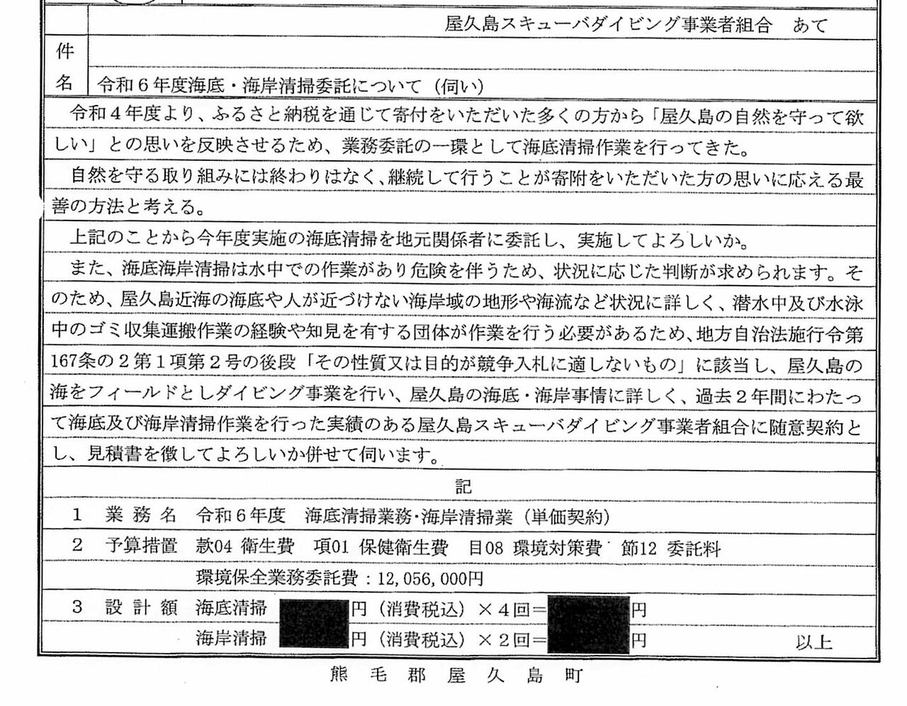 2024年度の海底清掃事業で、屋久島町は予定価格に相当する委託設計額を設定した(非開示部分は屋久島町が黒塗り加工)