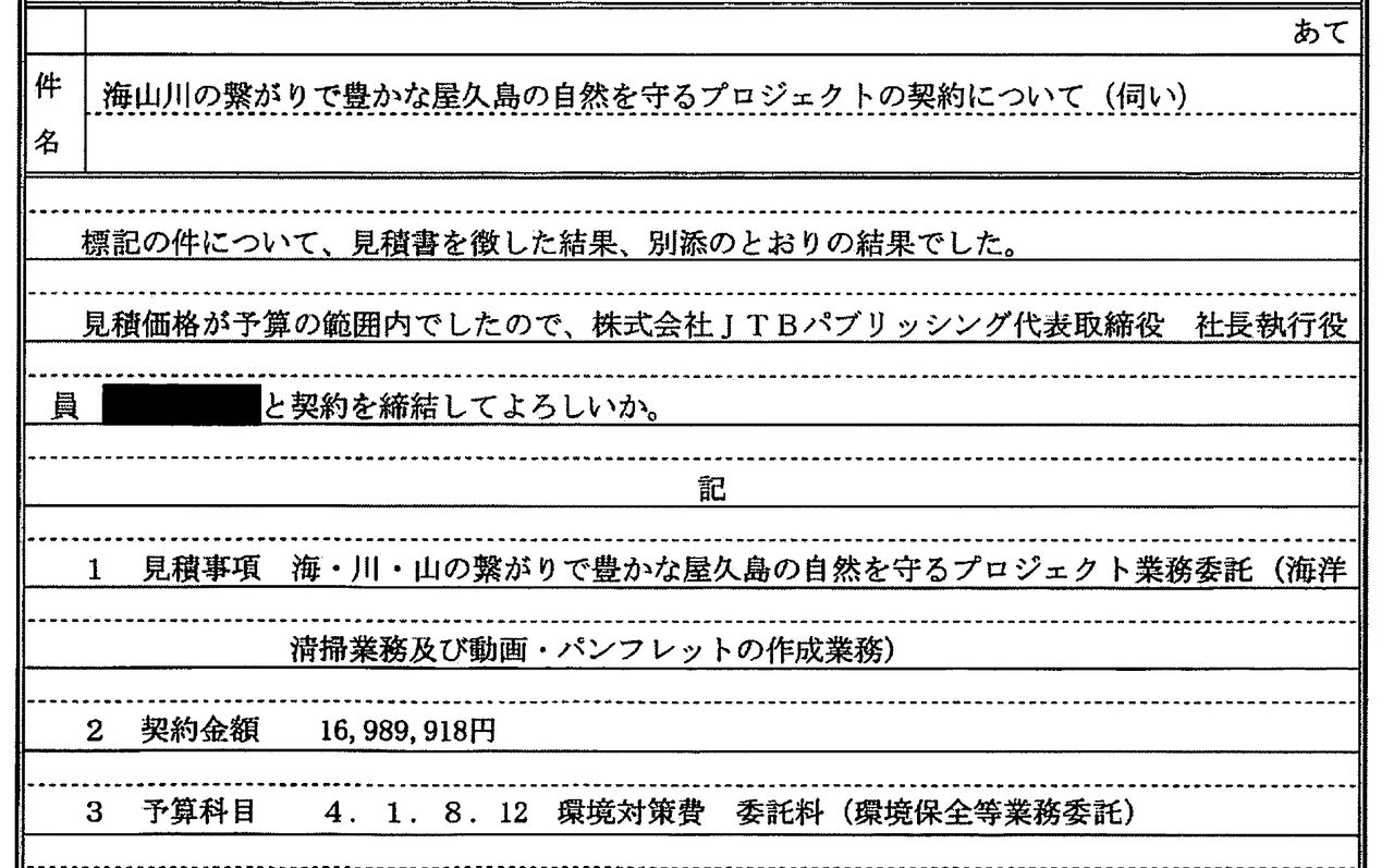 屋久島町は2022年7月11日にJTBパブリッシングから見積書を取り、同社と業務委託契約を結ぶための契約伺い文書を作成。文書のなかで「標記の件について、見積書を徴した結果、別添のとおりの結果でした。見積価格が予算の範囲内でしたので、株式会社JTBパブリッシング代表取締役 社長執行役員■■■■と契約を締結してよろしいか」としたうえで、「契約金額」として、見積額と同額である1698万9918円と記載した。さらに、町は「業務委託料」を見積額と同額である1698万9918円と決めたうえで、7月13日に同社と業務委託契約を結んだ。