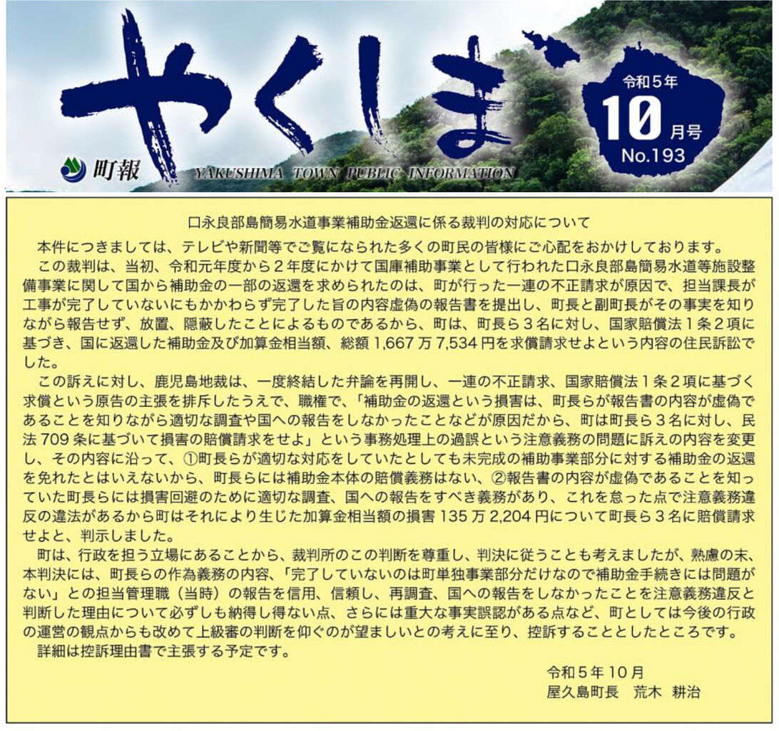 この住民訴訟をめぐっては、町が10月1日に上告を決めた際に、荒木町長は「判決文のなかに違法な部分があると思料されるので、最高裁に判断を仰ぎたい」とコメントを発表。それを受けて、総務課は屋久島ポストの取材に対し、上告理由の内容を町報に掲載して、住民に広報する予定だとしていた。
