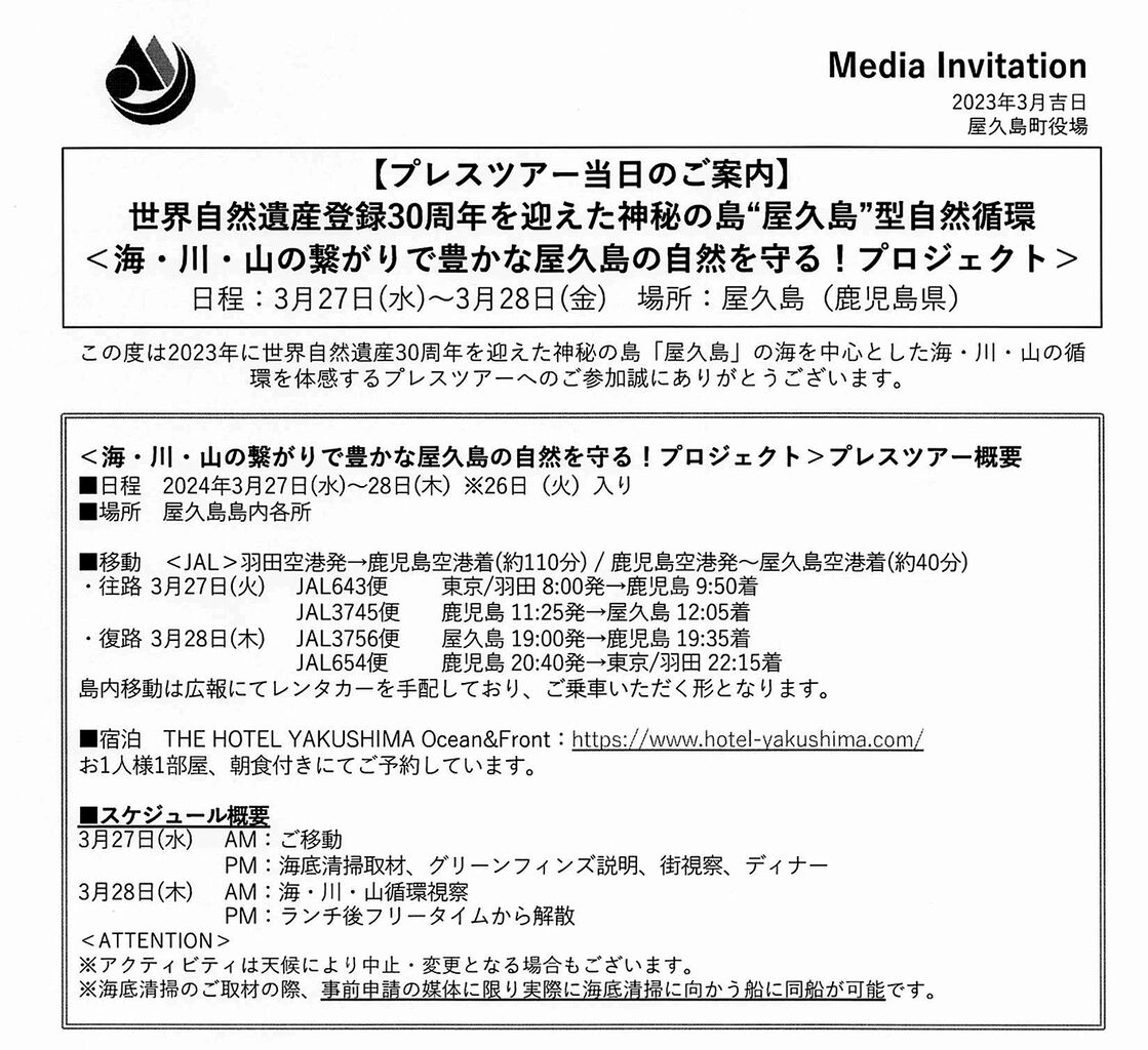 屋久島町が南日本新聞やMBC南日本放送など在鹿児島の地元メディアに出した「【取材のご案内】」