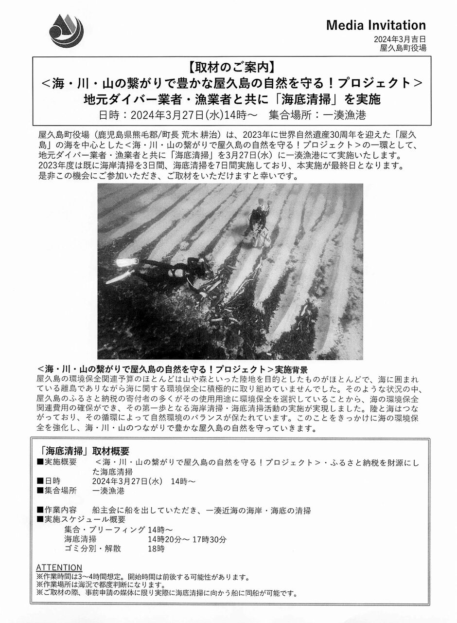 この事業の2年目となる2023年度の実績を広報するため、町が東京から3社のメディアを招待し、取材者5人の交通宿泊費を負担していたことが、屋久島ポストの取材でわかった。経費は「旅費交通費」として計上した232万円のなかから支出され、東京と屋久島の往復航空券代とホテル2泊分に充てられた。一方で町は、経費を負担しないことを前提に、南日本新聞やMBC南日本放送などにも取材案内を出したが、海底清掃事業の成果を報道した地元メディアはなかった。