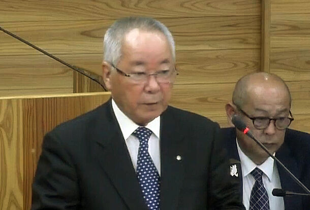 代船の業務委託費として1億1550万円を盛り込んだ補正予算案について説明する屋久島町の荒木耕治町長(2024年12月20日、屋久島町議会YouTubeチャンネルより)