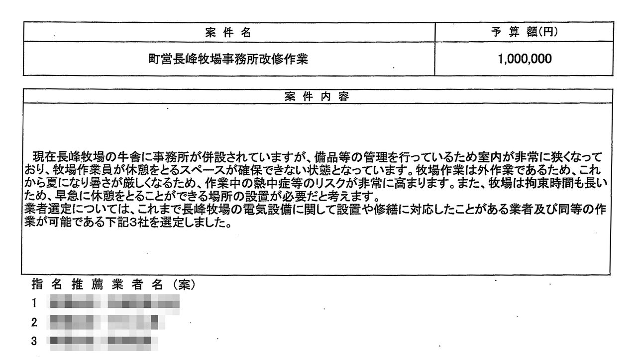 長峰牧場の休憩室を整備する工事業者を選定する際に、屋久島町が作成した文書。「熱中症等のリスク」や「牧場は拘束時間が長い」などとして、休憩室の必要性を説明している(※モザイクは屋久島ポストが加工)