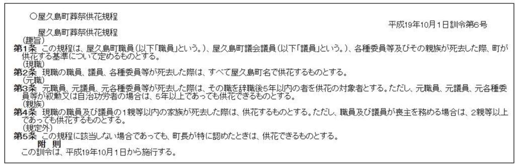 町のウェブサイトで、町の条例や規程などが掲載された例規集を検索すると、その答えがわかった。「屋久島町葬儀供花規程」というルールがあり、その第4条に次の規定がある。