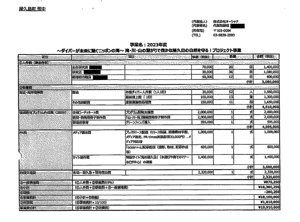2023年度、屋久島町が海底清掃事業を業務委託したダイビング業者「オーシャナ」(本社・東京都中央区)の見積書をじっくり見ると、世間相場では考えられない人件費が計上されている。前回の【視点】で紹介した「経理担当職員」は日給5万5000円(税込み)で、時給にすると約7000円にもなった。