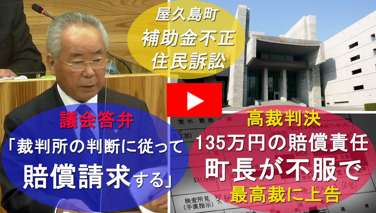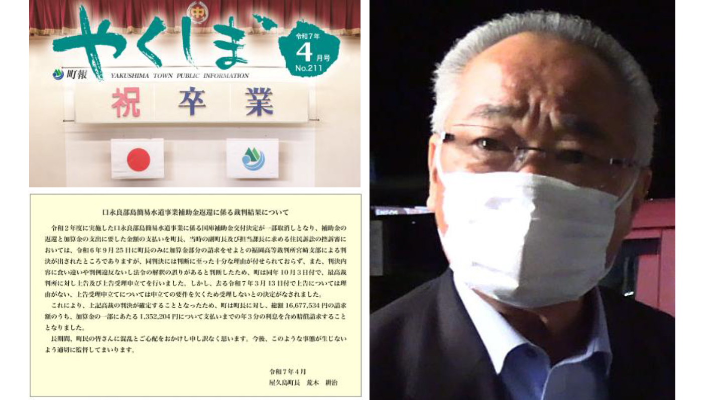 NHK鹿児島放送局は3月17日夜、屋久島町が実施した水道工事の補助金不正請求をめぐる住民訴訟で、最高裁が町の上告を棄却し、荒木耕治町長に約135万円の賠償責任があることを認めた控訴審判決が確定したことを報じた。