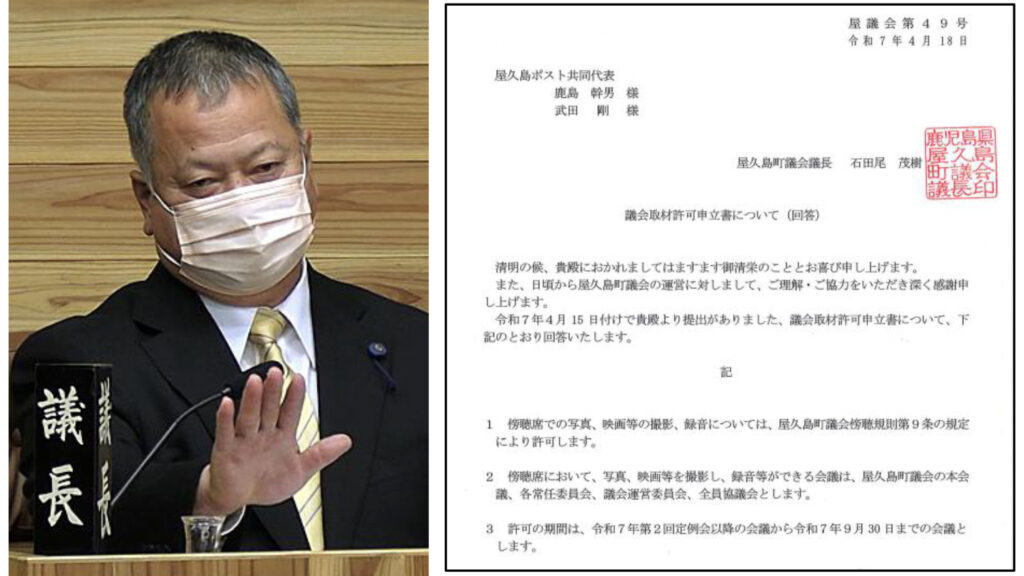 屋久島町民が運営する市民メディア「屋久島ポスト」が創刊したのは2021年11月。それ以来、屋久島町議会の石田尾茂樹議長は約3年半にわたり、屋久島ポストの議会取材を拒否し続ける一方、新聞やテレビなどのマスコミ各社には取材を許可してきた。