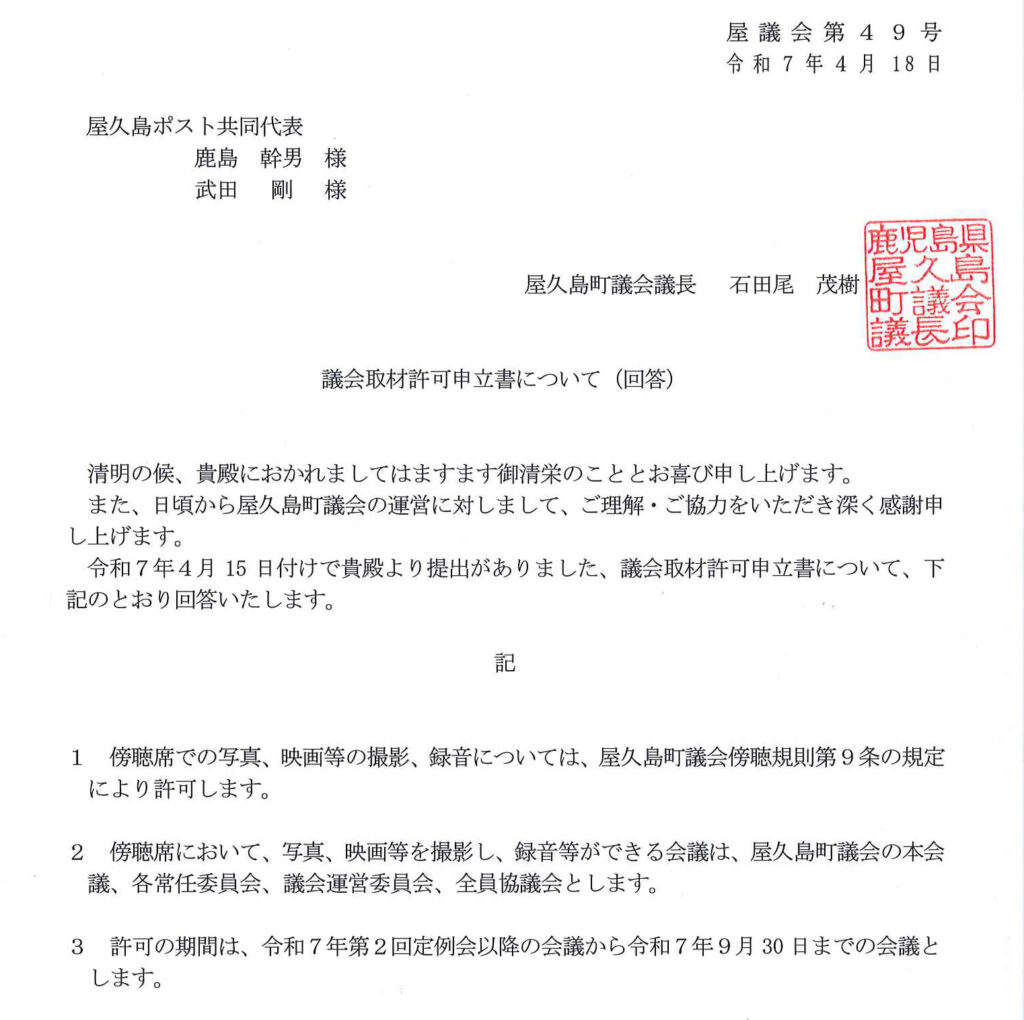 その石田尾議長が4月18日、屋久島ポストが出した「議会取材許可申立書」に対し、これまでの判断を一転させて取材を許可した。どうして方針を転換したのかは定かでないが、おそらく、取材を拒否する法的な根拠がないのであろう。マスコミ各社は「報道」で、それ以外の取材者は「報道ではない」と区別することは認められず、その当然の事実に気づいたのではないか。