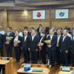 屋久島町議会(石田尾茂樹議長)は8月27日、定例会最終日の本会議を終えた。閉会後、今期で引退する真辺真紀、岩山鶴美、緒方健太、岩川俊広の各町議には、石田尾議長から花束を贈呈。続いて荒木耕治町長ら町執行部も一緒に記念撮影をして、長年にわたる労をねぎらった。