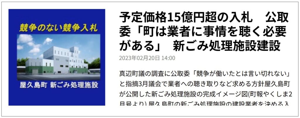 今年10月に竣工する屋久島町の新ごみ処理施設は、建設業者を決める入札の段階で、大きな疑惑を抱えていた。