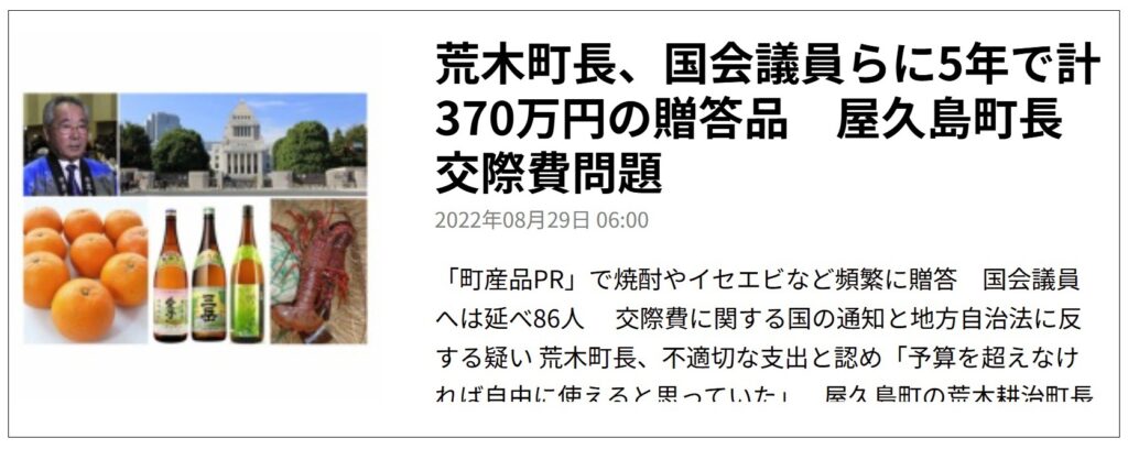 屋久島町長の交際費問題について伝えた屋久島ポストの初報記事(2022年8月29日配信)