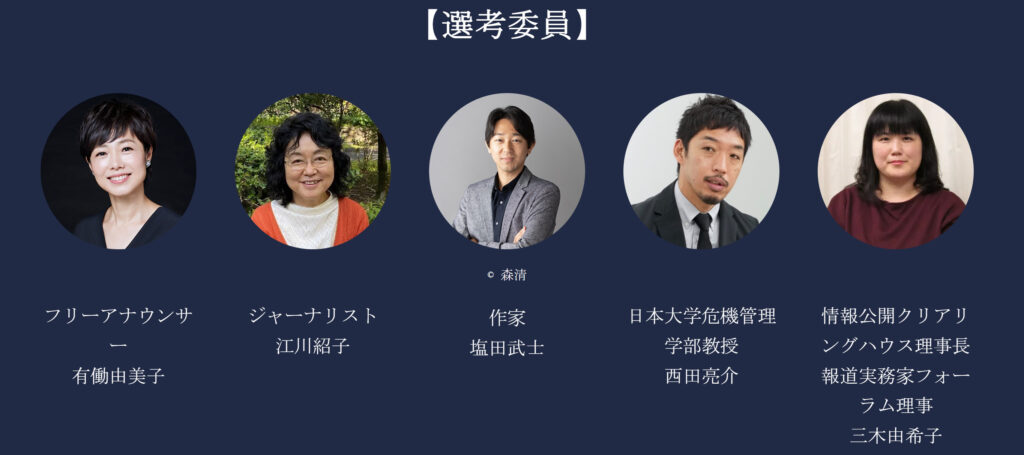 今年は約100点の応募があり、選考委員をフリーアナウンサーの有働由美子氏、ジャーナリストの江川紹子氏、作家の塩田武士氏、日本大学危機管理学部教授の西田亮介氏、情報公開クリアリングハウス理事長・報道実務家フォーラム理事の三木由希子氏が務めた。