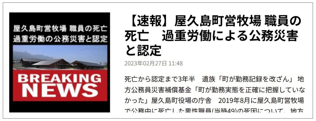 2019年8月、屋久島町営の長峰牧場で男性職員(当時49)が公務中に亡くなった。当初、死因は「不明」とされたが、遺族は過労死ではないかと疑い、民間の労働災害にあたる公務災害を申請した。その結果、地方公務員災害補償基金の鹿児島県支部は2023年2月、職員の死因について、過重労働で心筋梗塞を発症したことによる公務災害と認定した。