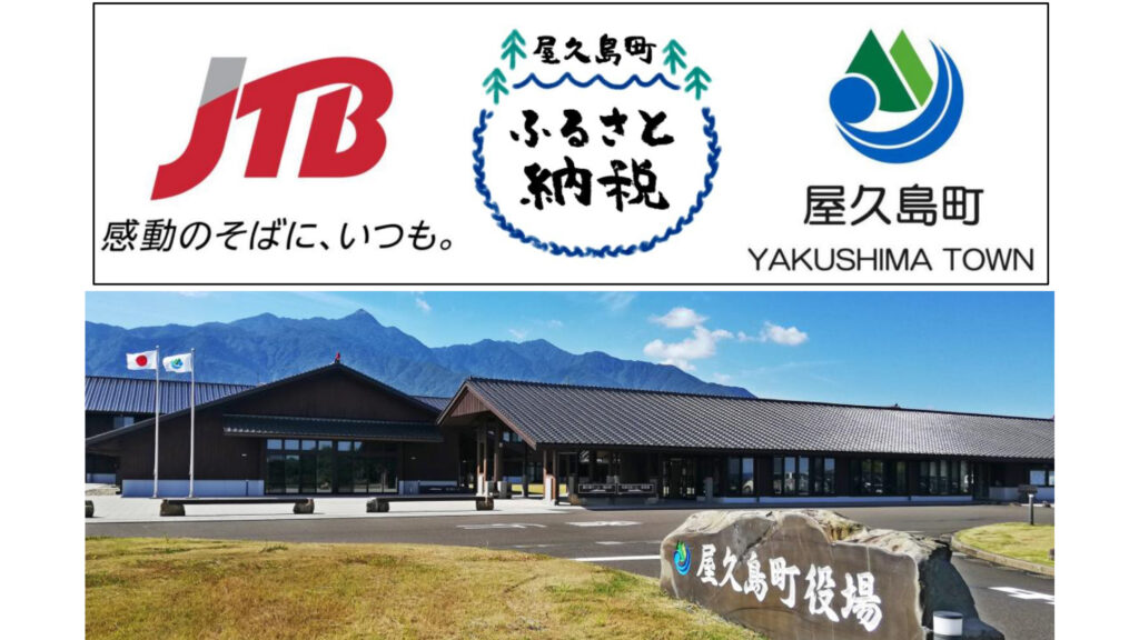 【上左】海底清掃事業を請け負ったJTBパブリッシングが入るJTBグループのロゴとスローガン【上中・上右】「屋久島町ふるさと納税」と屋久島町のロゴ(町ウェブサイトより)【下】屋久島町役場