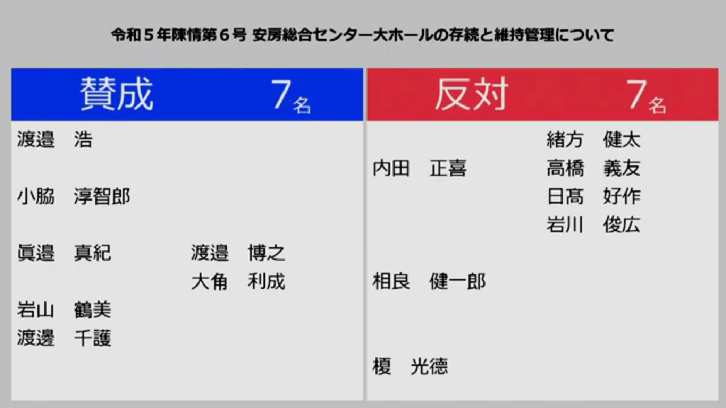反対した町議のなかには、南部地域に居住する日高好作、相良健一郎、緒方健太の名前もあった。もし、この3人が賛成していれば、町長の荒木耕治ら町幹部に対し、安房大ホールを守りたいという願いを届けられたとあって、南部地域の住民にとっては納得できない結果だった。