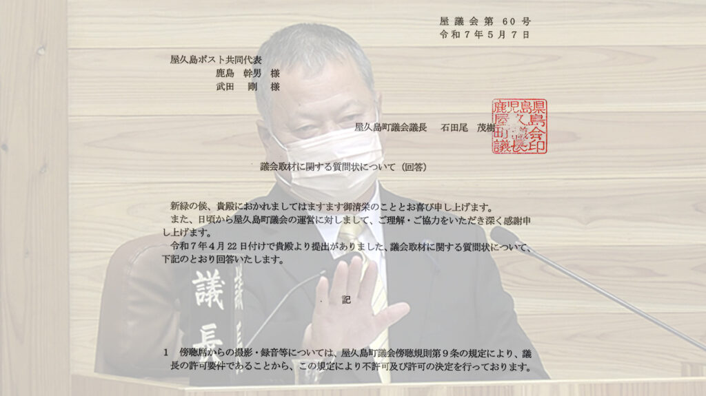 屋久島ポストは2021年11月の創刊以来、約3年半にわたって傍聴席での撮影と録音を禁止されてきた。それを踏まえ、屋久島ポストが4月15日に「議会取材許可申立書」を出したところ、石田尾議長は一転して取材を許可。それに対し、屋久島ポストは4月18日に「議会取材に関する質問状」を出し、次の質問を石田尾議長に投げかけた。