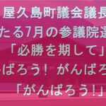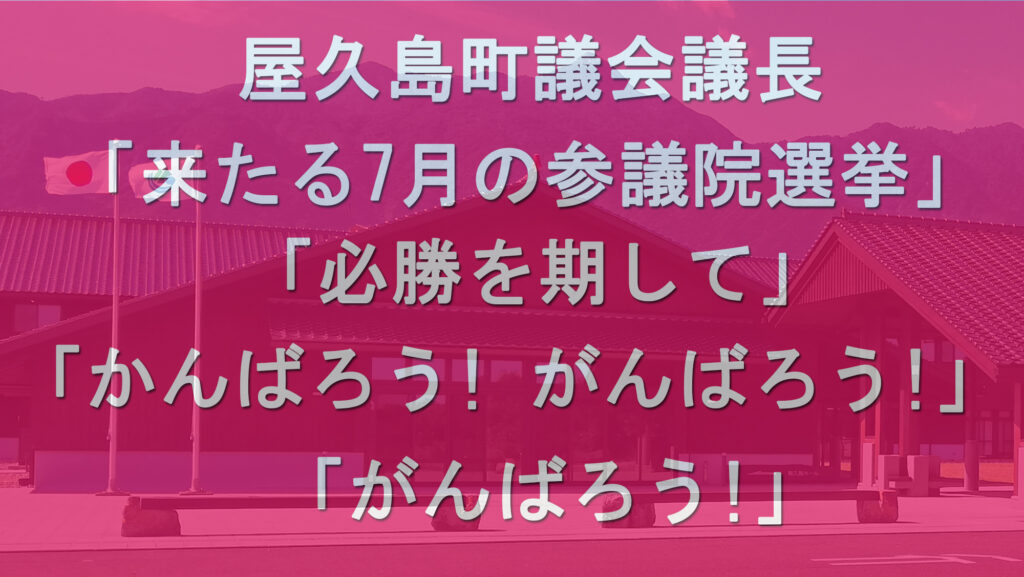 屋久島町議会の石田尾茂樹議長と岩山鶴美町議が5月17日に開かれた「森山裕国政報告会」で、7月の参院選に出馬予定の候補者名を挙げて、約250人の町民らと一緒に必勝祈願の「がんばろう!」三唱をした問題――。