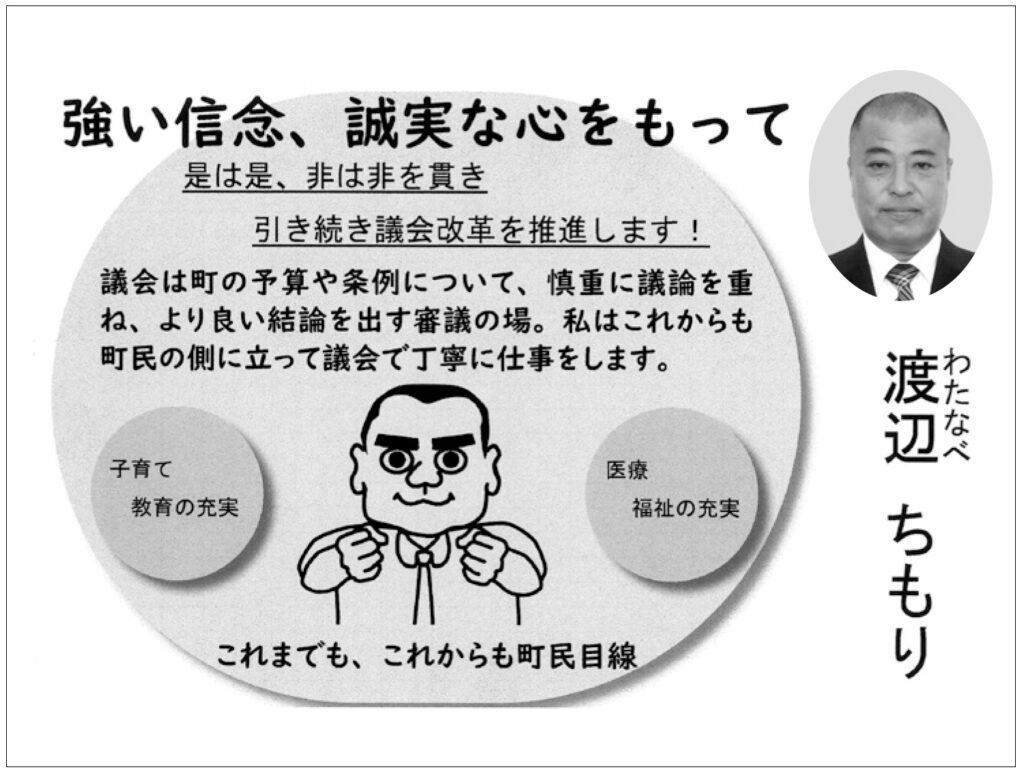 2025.09.17 2025.11.16 屋久島町議選2025 【渡辺千護 候補】強い信念、誠実な心をもって/屋久島町議選2025 yakushima-post 選挙公約:是は是、非は非を貫き 引き続き議会改革を推進します! 任期満了に伴う屋久島町議選(定数14)は9月16日に告示され、現職12人、新人4人の計16人が立候補した。 町選挙管理委員会が公開した選挙公報に掲載された渡辺千護候補の公約を以下に紹介する(敬称略)。 渡辺千護(船行)=現職 #屋久島町#屋久島町議会#屋久島町議会選挙#選挙