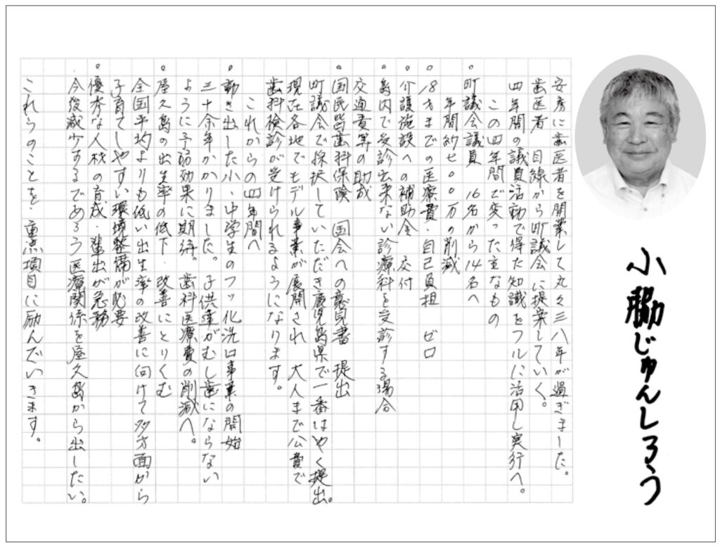 2025.09.17 2025.11.16 屋久島町議選2025 【小脇淳智郎 候補】安心して暮らせる屋久島のために/屋久島町議選2025 yakushima-post 選挙公報:医療改革 福祉改革 教育改革 任期満了に伴う屋久島町議選(定数14)は9月16日に告示され、現職12人、新人4人の計16人が立候補した。 町選挙管理委員会が公開した選挙公報に掲載された小脇淳智郎候補の公約を以下に紹介する(敬称略)。 小脇淳智郎(安房)=現職 #屋久島町#屋久島町議会#屋久島町議会選挙#選挙