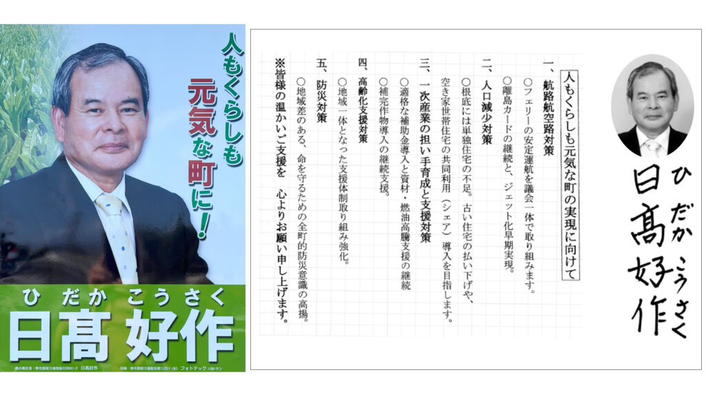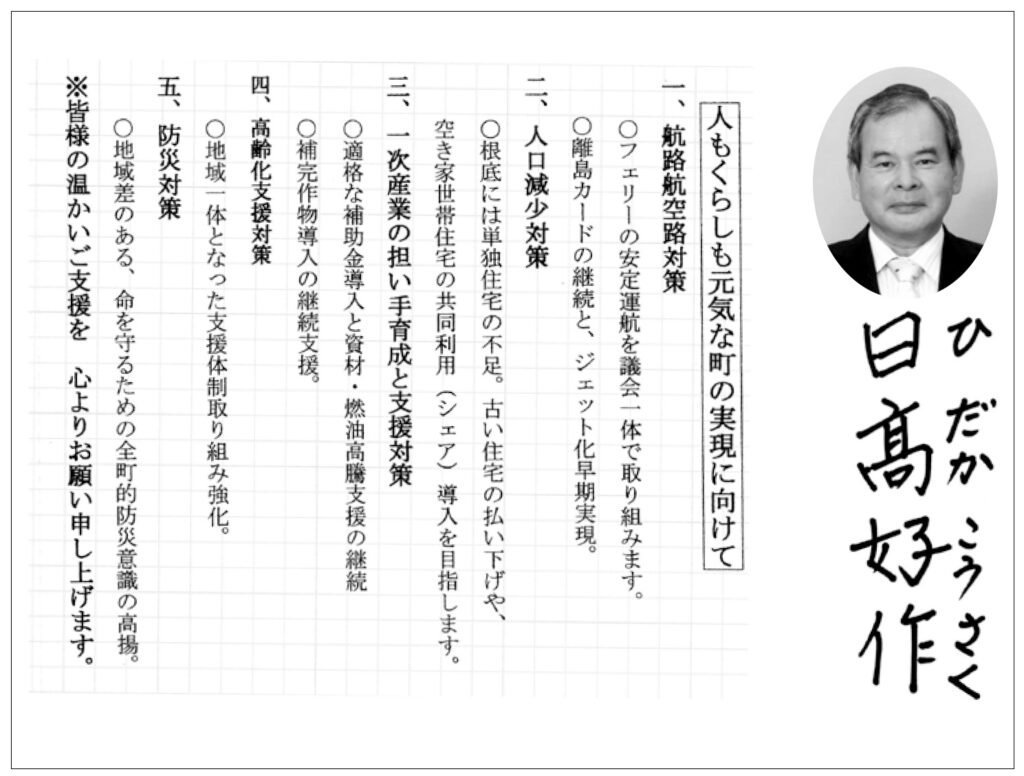 2025.09.17 2025.11.16 屋久島町議選2025 【日高好作 候補】人もくらしも元気な町に!/屋久島町議選2025 yakushima-post 選挙公報:人もくらしも元気な町の実現に向けて 任期満了に伴う屋久島町議選(定数14)は9月16日に告示され、現職12人、新人4人の計16人が立候補した。 町選挙管理委員会が公開した選挙公報に掲載された日高好作候補の公約を以下に紹介する(敬称略)。 日高好作(船行)=現職 #屋久島町#屋久島町議会#屋久島町議会選挙#選挙