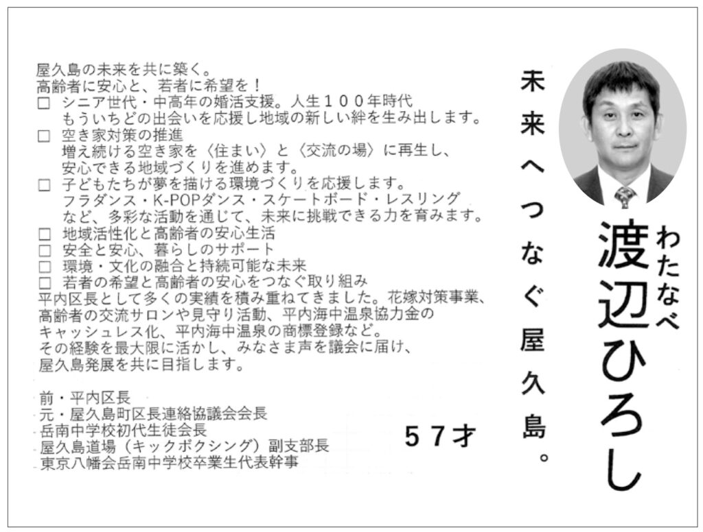 2025.09.17 2025.11.16 屋久島町議選2025 【渡辺浩 候補】屋久島の未来を共に築く。/屋久島町議選2025 yakushima-post 選挙公報:未来へつなぐ屋久島。 任期満了に伴う屋久島町議選(定数14)は9月16日に告示され、現職12人、新人4人の計16人が立候補した。 町選挙管理委員会が公開した選挙公報に掲載された渡辺浩候補の公約を以下に紹介する(敬称略)。 #屋久島町#屋久島町議会#屋久島町議会選挙#選挙