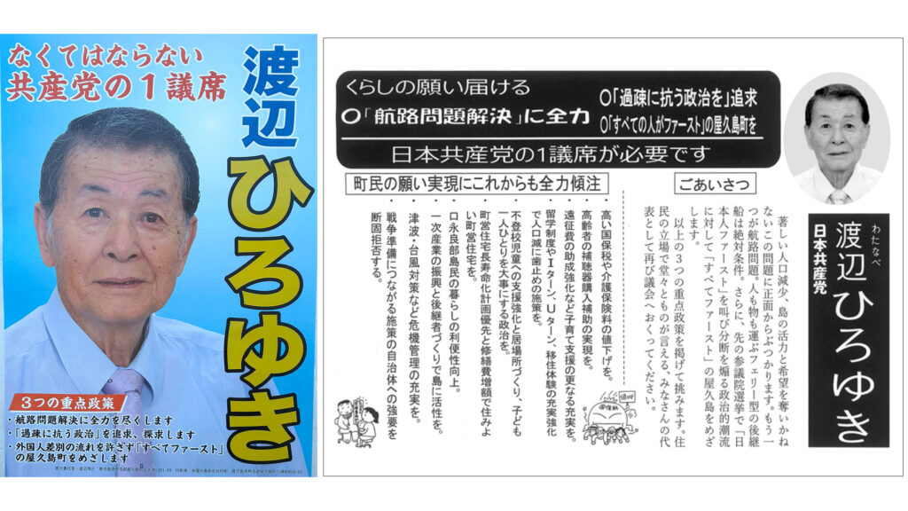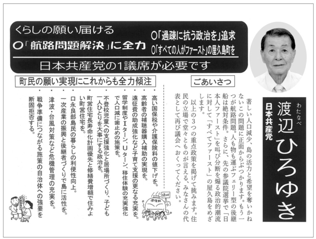 2025.09.17 2025.11.16 屋久島町議選2025 【渡辺博之 候補】なくてはならない共産党の1議席/屋久島町議選2025 yakushima-post 選挙公報:くらしの願い届ける 3つの重点政策 任期満了に伴う屋久島町議選(定数14)は9月16日に告示され、現職12人、新人4人の計16人が立候補した。 町選挙管理委員会が公開した選挙公報に掲載された渡辺博之候補の公約を以下に紹介する(敬称略)。 渡辺博之(宮之浦)=現職 #屋久島町#屋久島町議会#屋久島町議会選挙#選挙