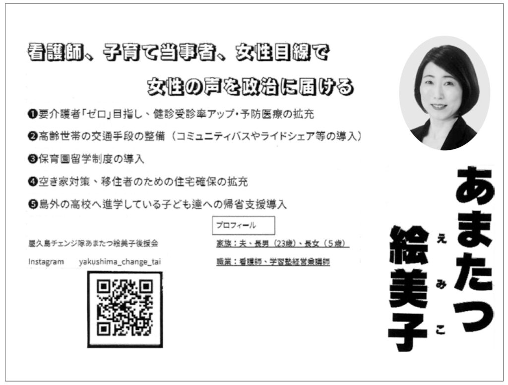 2025.09.17 2025.11.16 屋久島町議選2025 【天辰絵美子 候補】女性の声を政治に届ける/屋久島町議選2025 yakushima-post 選挙公報:看護師、子育て当事者、女性目線で 女性の声を政治に届ける 任期満了に伴う屋久島町議選(定数14)は9月16日に告示され、現職12人、新人4人の計16人が立候補した。 町選挙管理委員会が公開した選挙公報に掲載された天辰絵美子候補の公約を以下に紹介する(敬称略)。 天辰絵美子(小瀬田)=新人 #屋久島町#屋久島町議会#屋久島町議会選挙#選挙