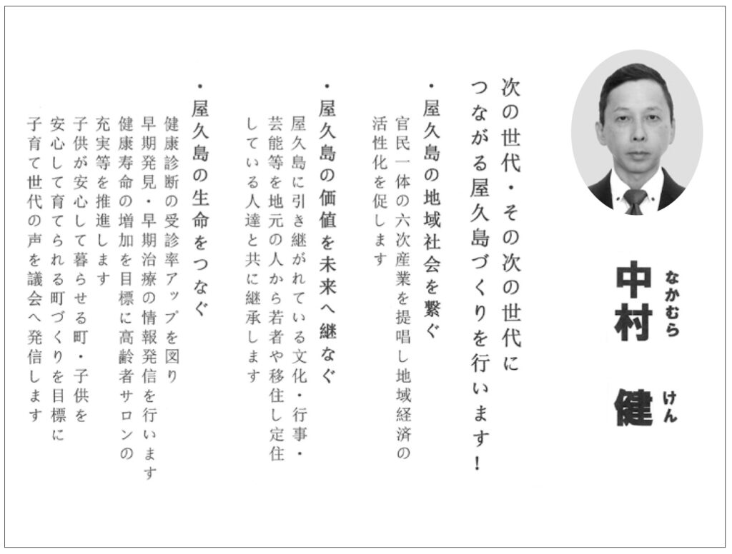 2025.09.17 2025.11.16 屋久島町議選2025 【中村健 候補】屋久島をつなぐ子育て世代として頑張ります!!/屋久島町議選2025 yakushima-post 選挙公報:次の世代・その次の世代につながる屋久島づくりを行います! 任期満了に伴う屋久島町議選(定数14)は9月16日に告示され、現職12人、新人4人の計16人が立候補した。 町選挙管理委員会が公開した選挙公報に掲載された中村健候補の公約を以下に紹介する(敬称略)。 中村健(中間)=新人 #屋久島町#屋久島町議会#屋久島町議会選挙#選挙