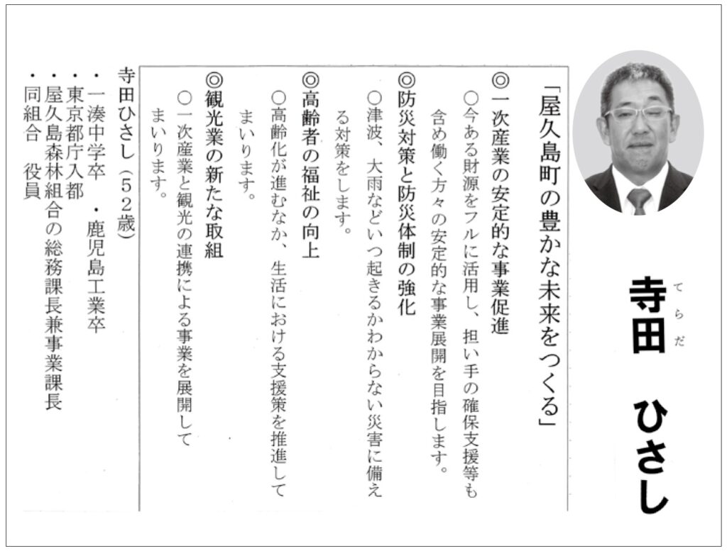 2025.09.17 2025.11.16 屋久島町議選2025 【寺田久 候補】屋久島町の豊かな未来をつくる/屋久島町議選2025 yakushima-post 選挙公報:「屋久島町の豊かな未来をつくる」 任期満了に伴う屋久島町議選(定数14)は9月16日に告示され、現職12人、新人4人の計16人が立候補した。 町選挙管理委員会が公開した選挙公報に掲載された寺田久候補の公約を以下に紹介する(敬称略)。 寺田久(一湊)=新人 #屋久島町#屋久島町議会#屋久島町議会選挙#選挙