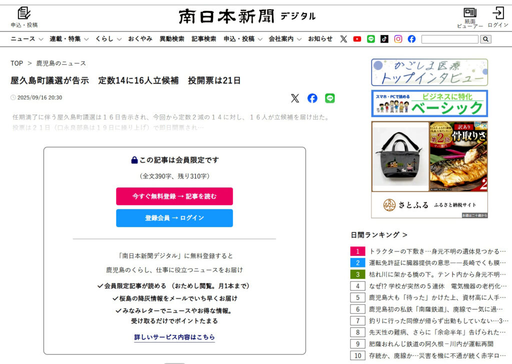 屋久島町議選については、地元紙の南日本新聞もしっかりと報道しています。ですが、今回初めてわかったのは、実紙面を購読していない、またはデジタル版の有料会員ではない有権者は、どこの誰が立候補したのかを記事で知ることができないということです。