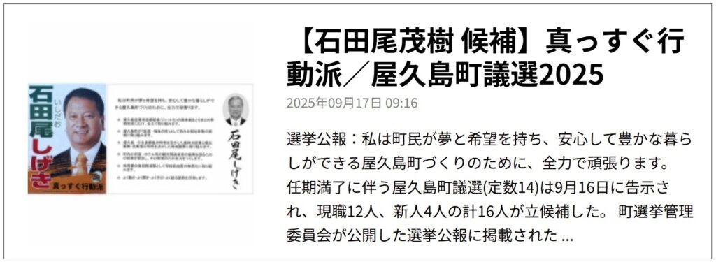 屋久ポストの取材禁止を最終的に決めたのは、議長の石田尾茂樹氏です。では、その石田尾氏は選挙公約で何を訴えているのか。